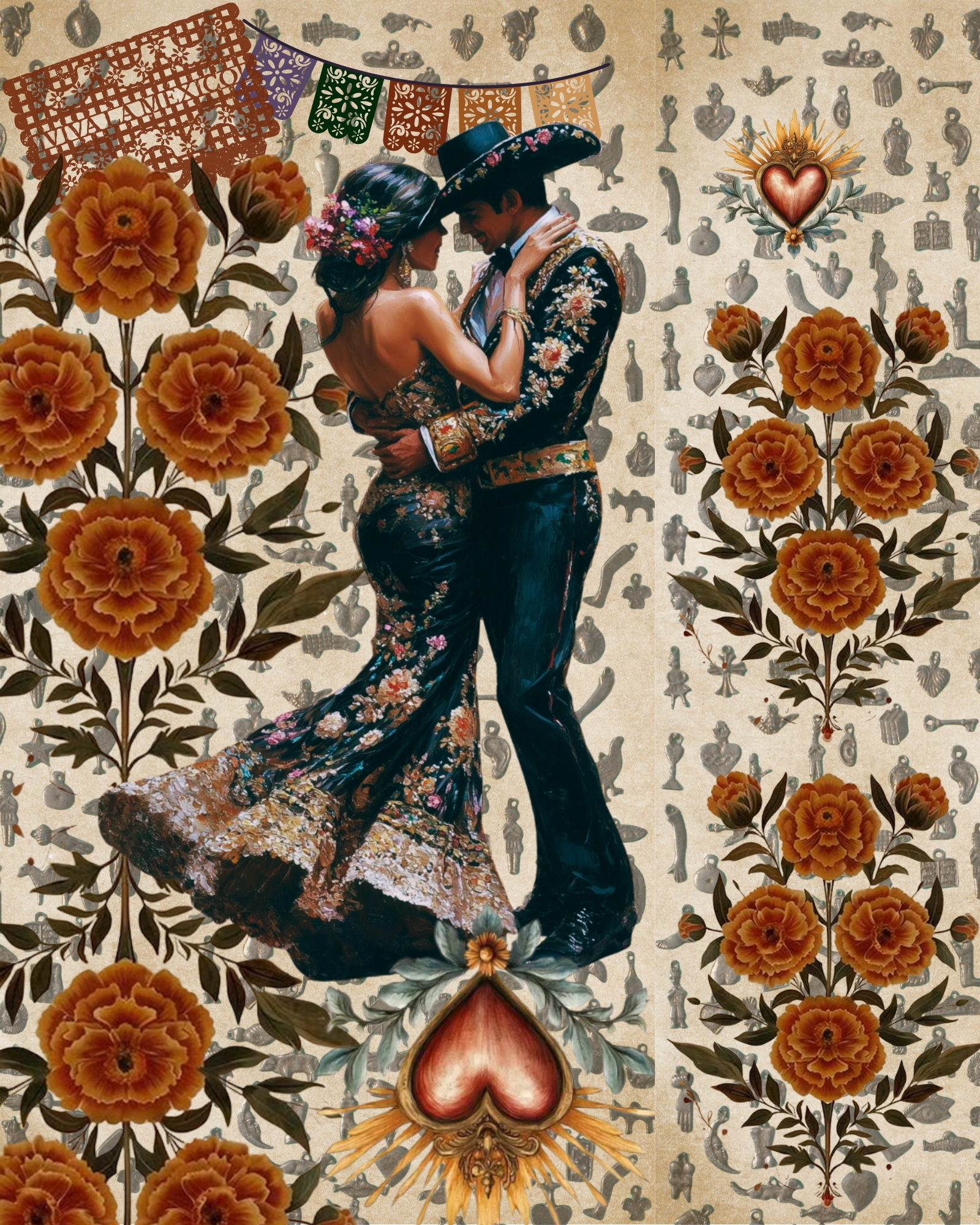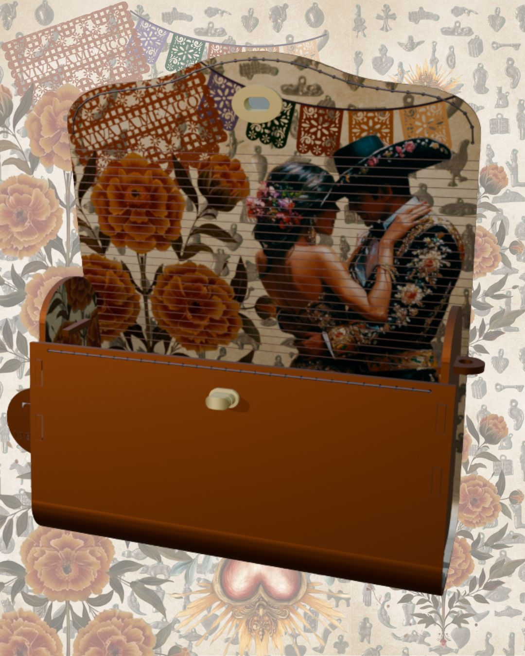 Driven by the romance and drama of a telenovela, the artwork features marigolds, a sacred heart, and a collage of Milagros charms in the background. The burnt orange stain and warm color story portrays the sunny and colorful landscape of Mexico City, and the collaged art inside captures the magical, deeply spiritual pride found within the country of Mexico.