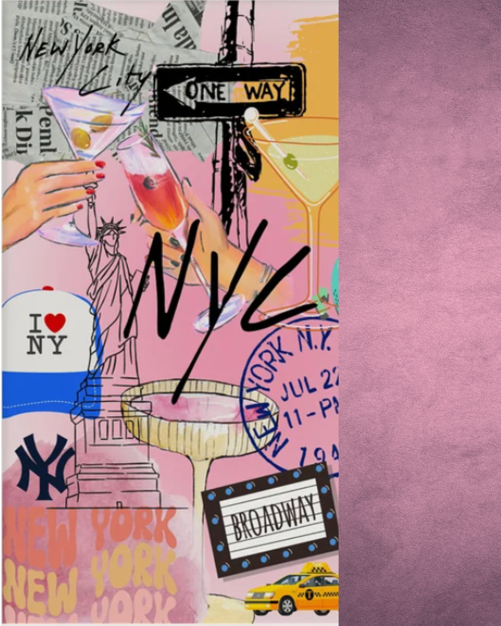 Cute, pink, bold and cheeky, the imagery collaged in this interior captures the feeling of being a tourist in New York. Cheers and street signs, girlhood and adventure, its giving Carrie Bradshaw meets her biggest fan.