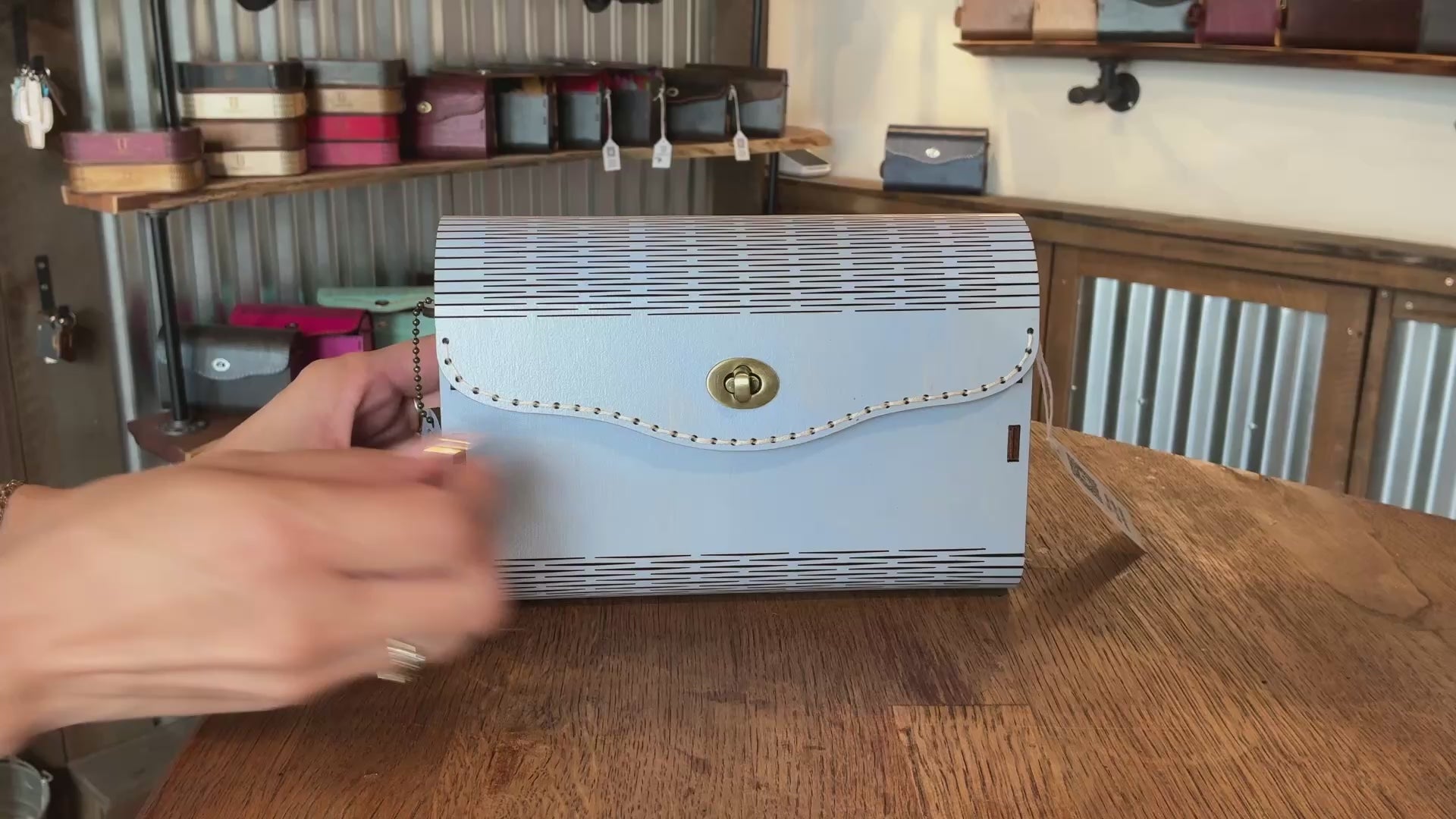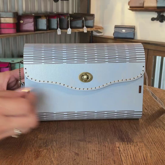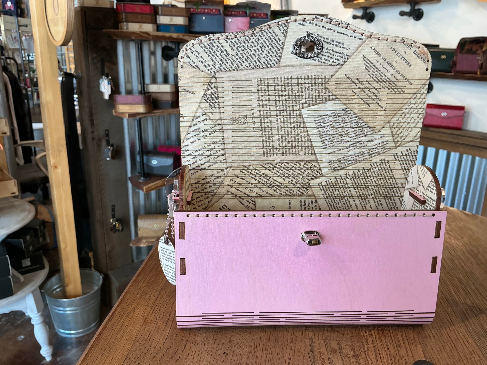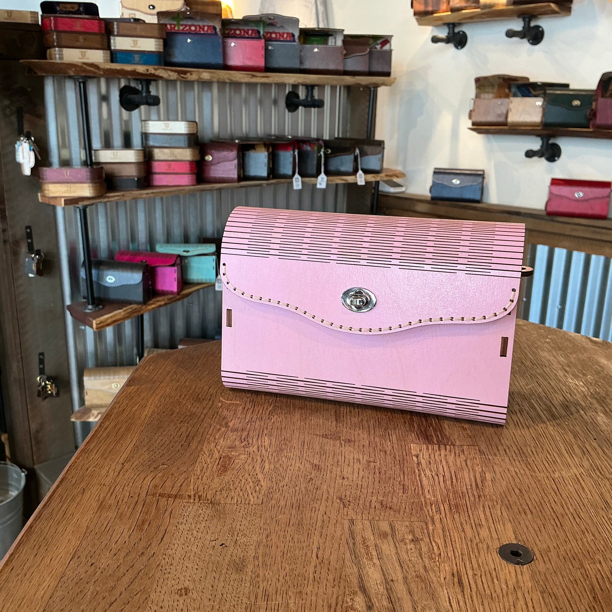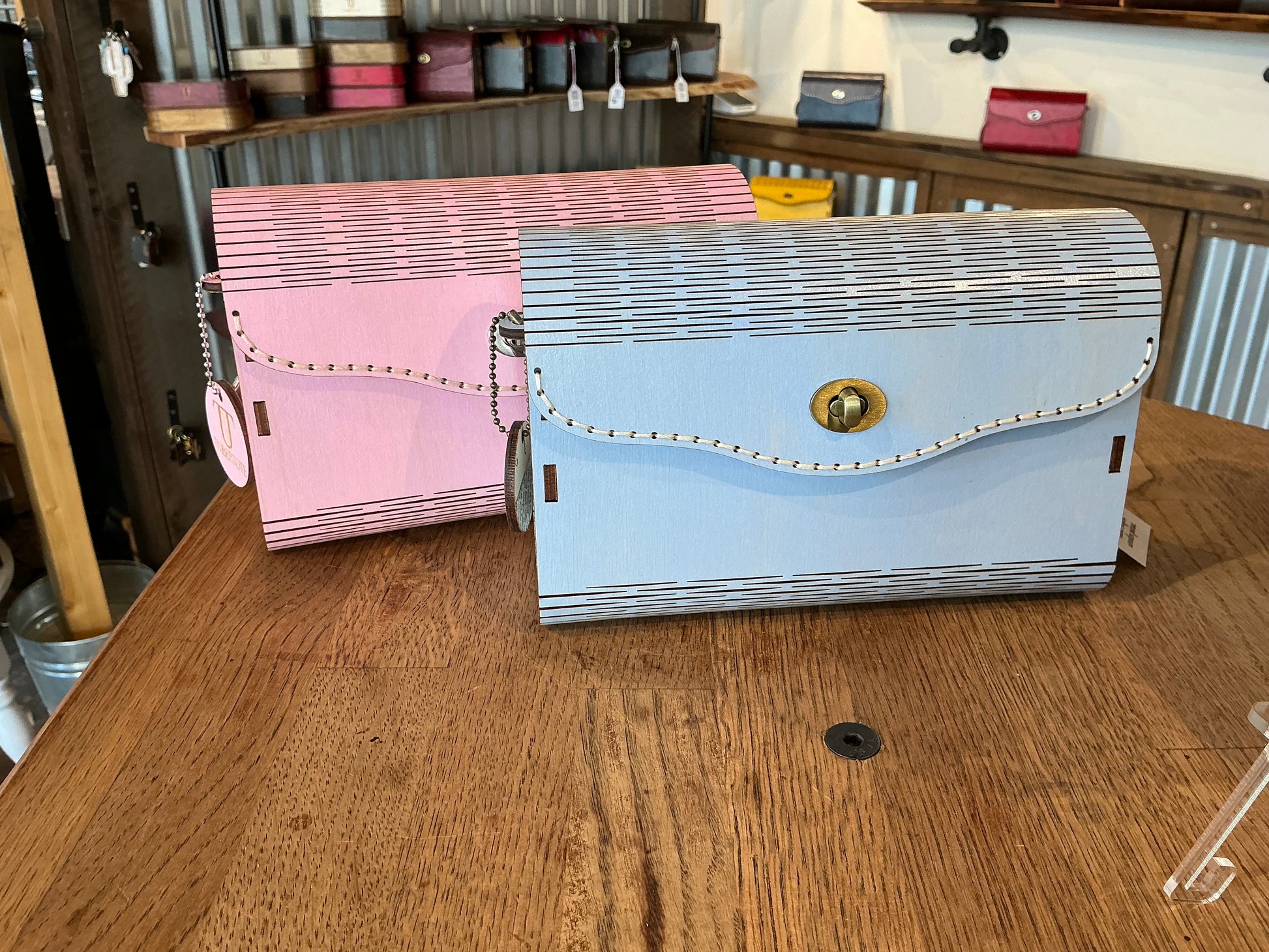 Premium Birch wood exterior, stained and finished in a light pink or blue stain. 100% Cotton interior which is adhered to the wood before cutting for a cohesive experience inside and out. Strap included.
