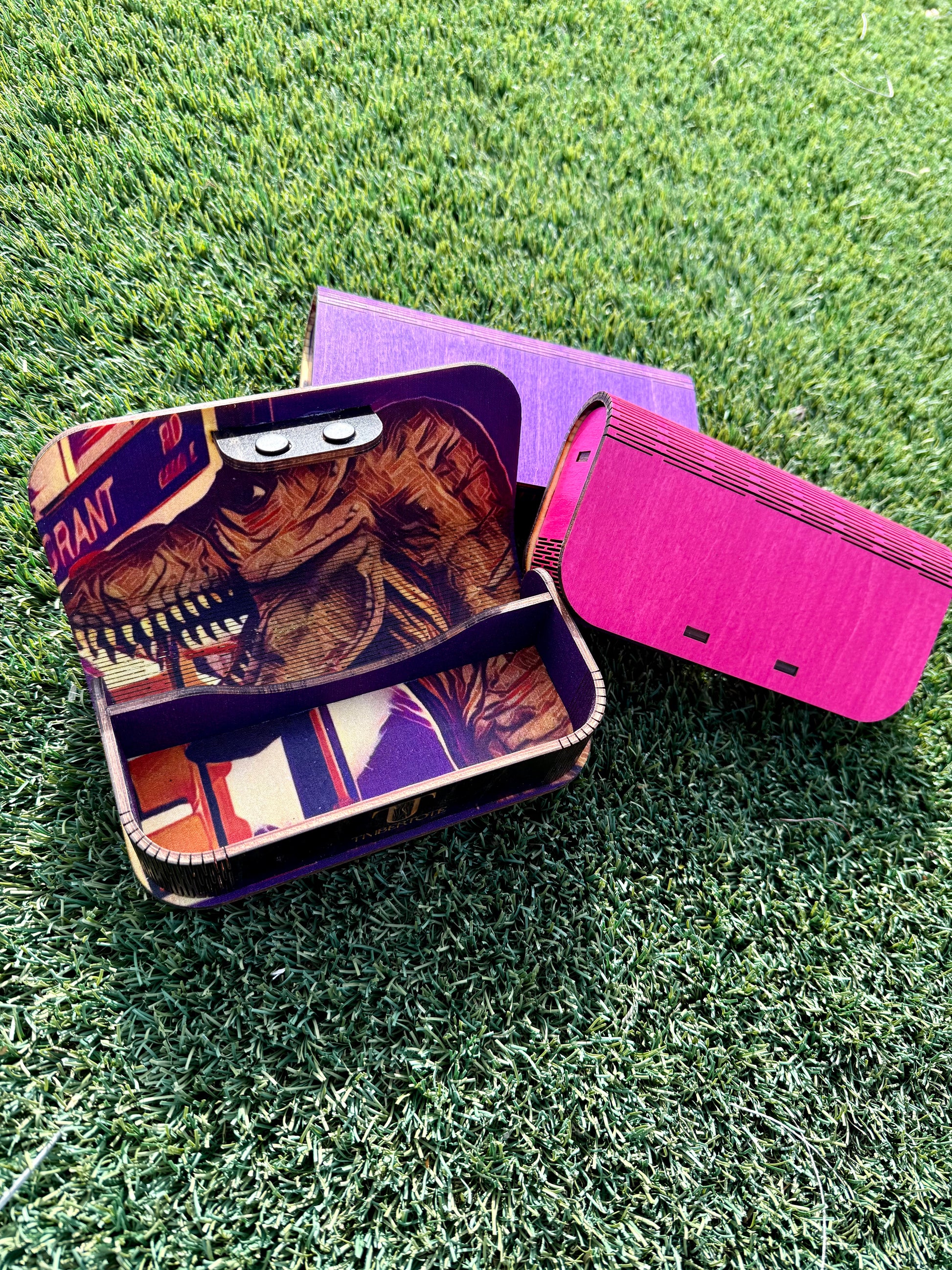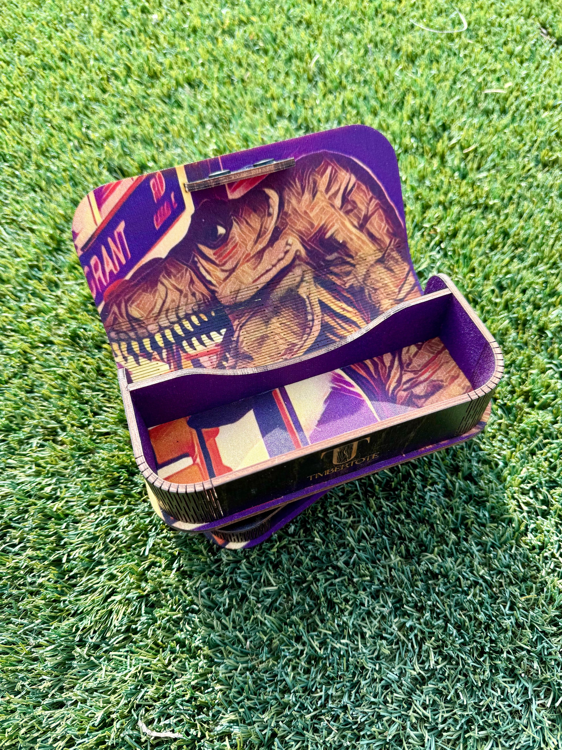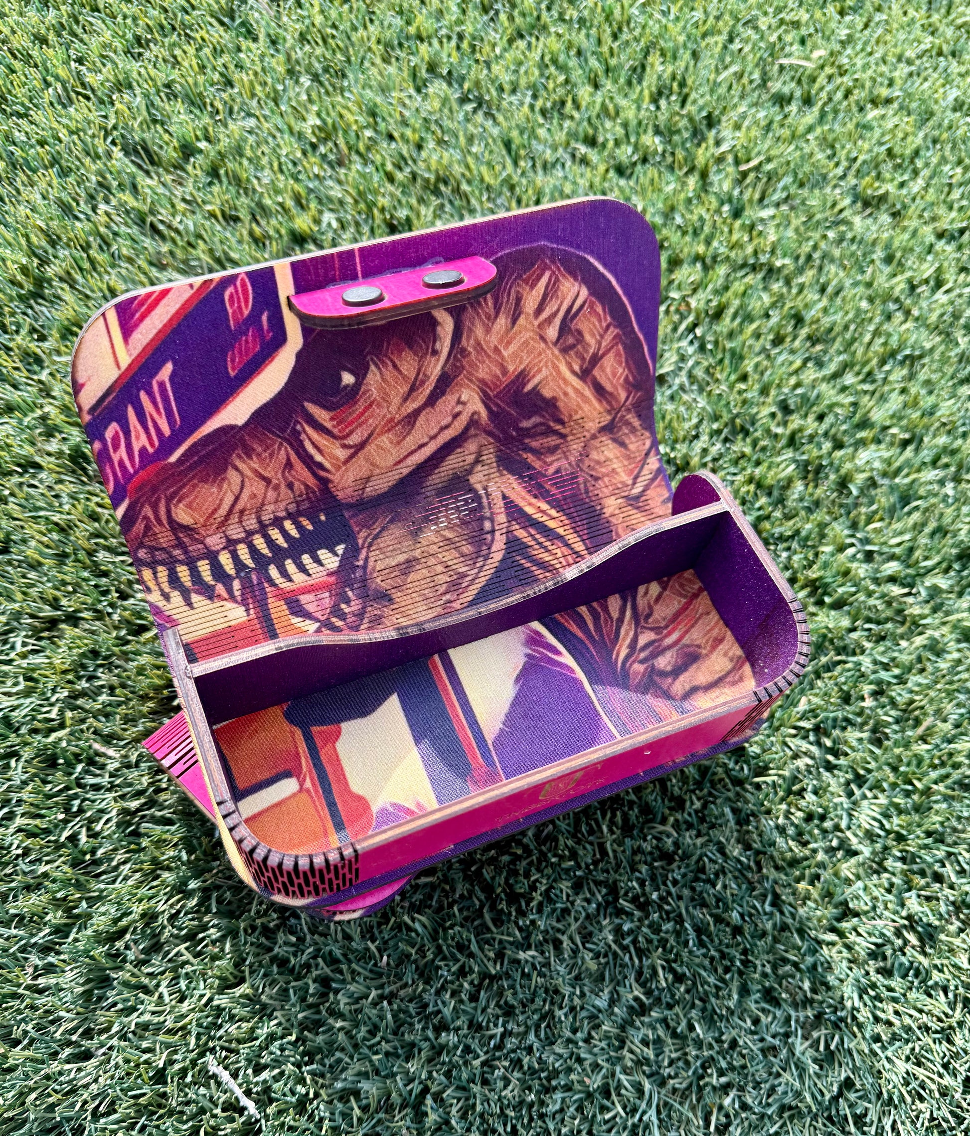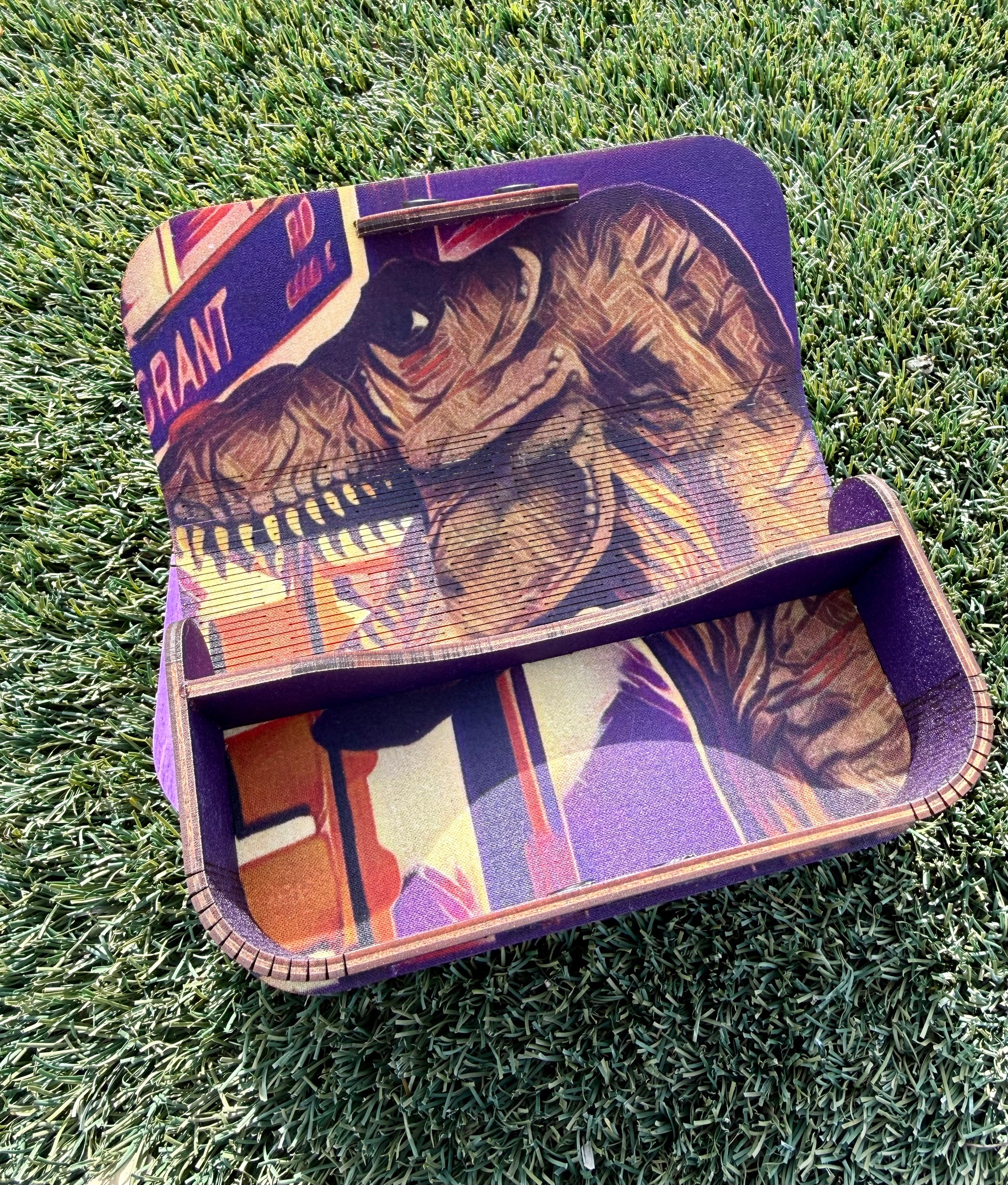 Eyeglasses case featuring Tucson’s favorite T-Rex that stands on Grant and Kolb, photographed and styled by Enrique Aldana. Available in black, pink, and purple.