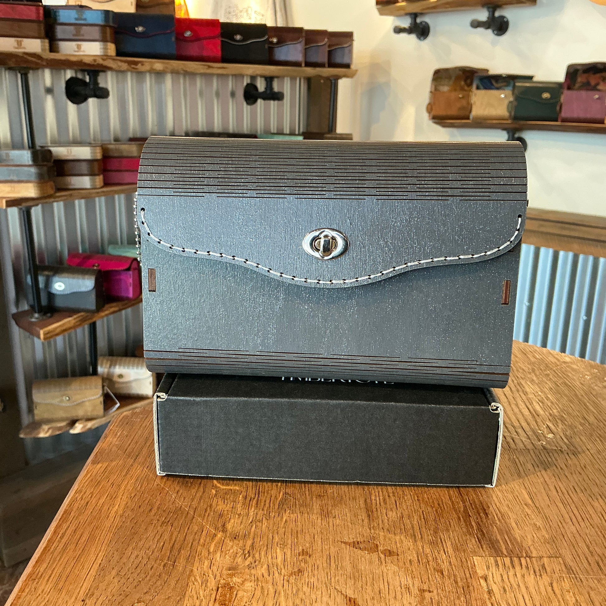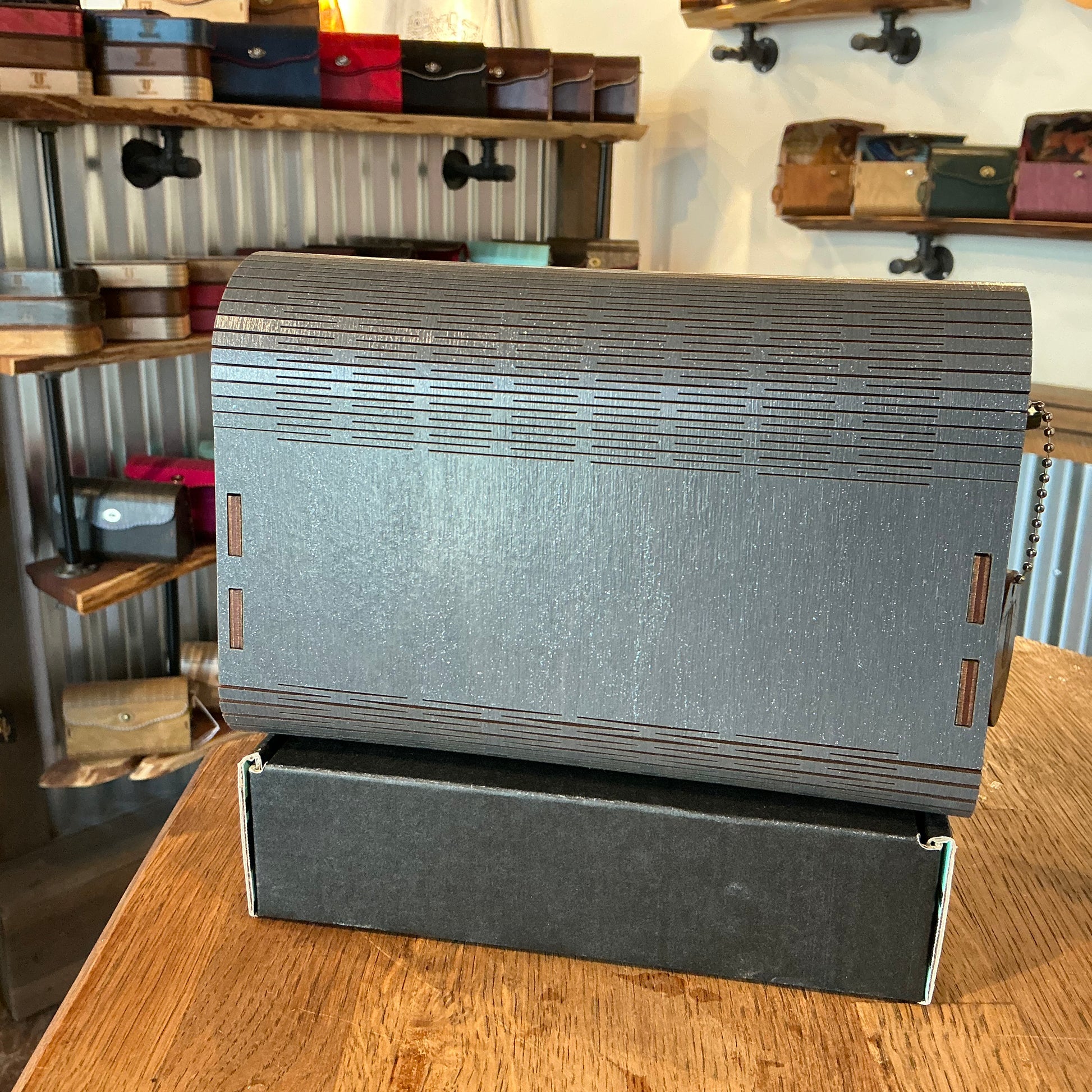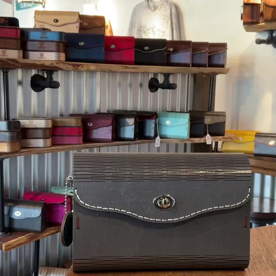 Premium Birch wood exterior, with a grey sparkle stain. 100% Cotton glow in the dark interior which is adhered to the wood before cutting for a cohesive experience inside and out. Complimentary strap is included.
