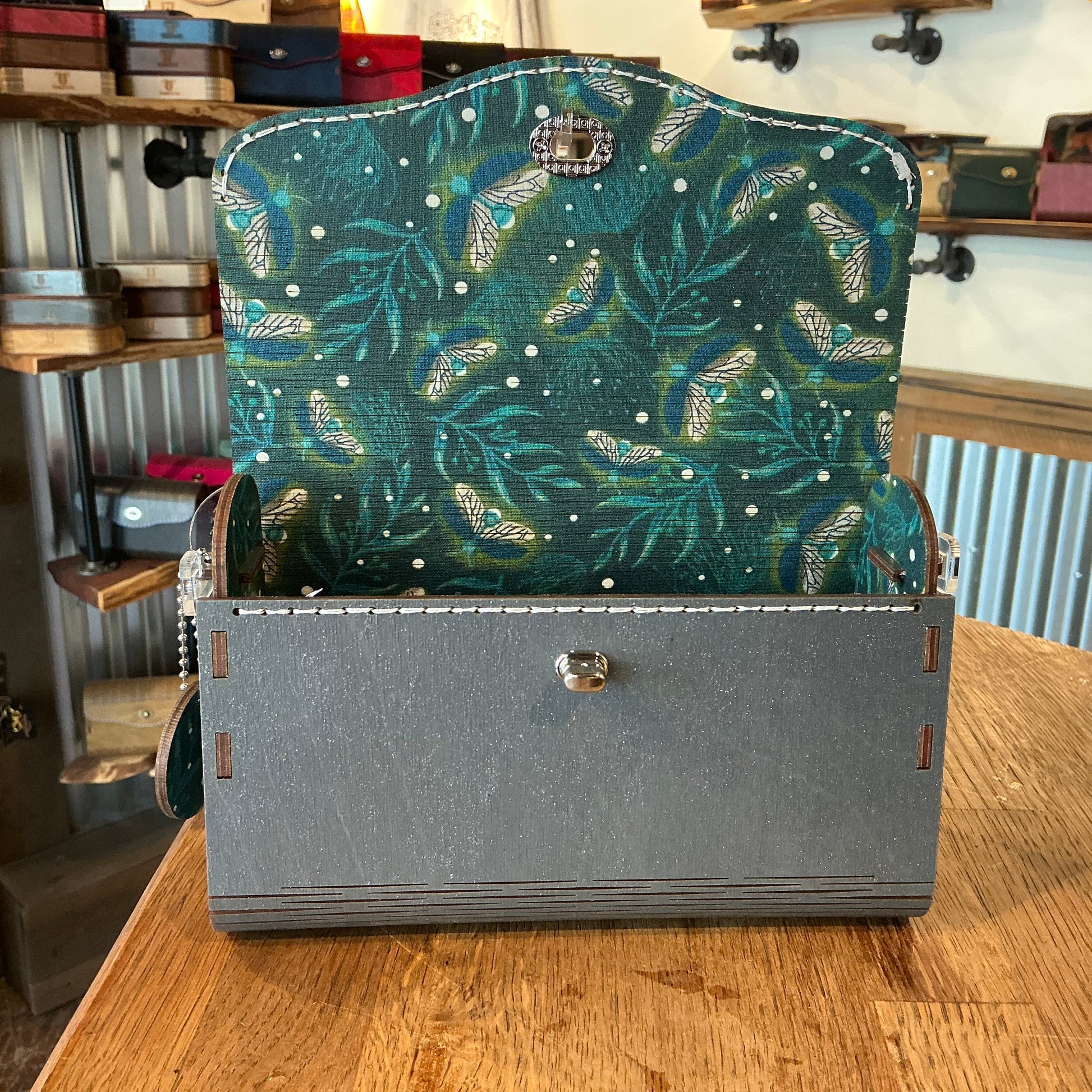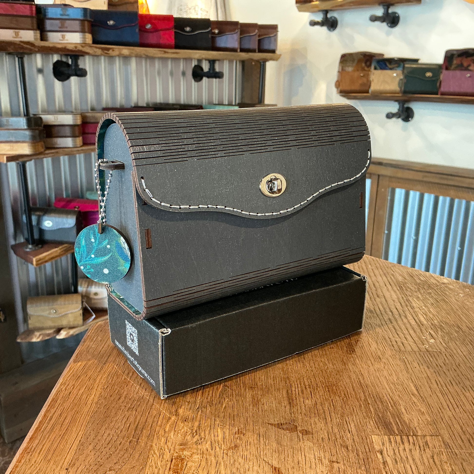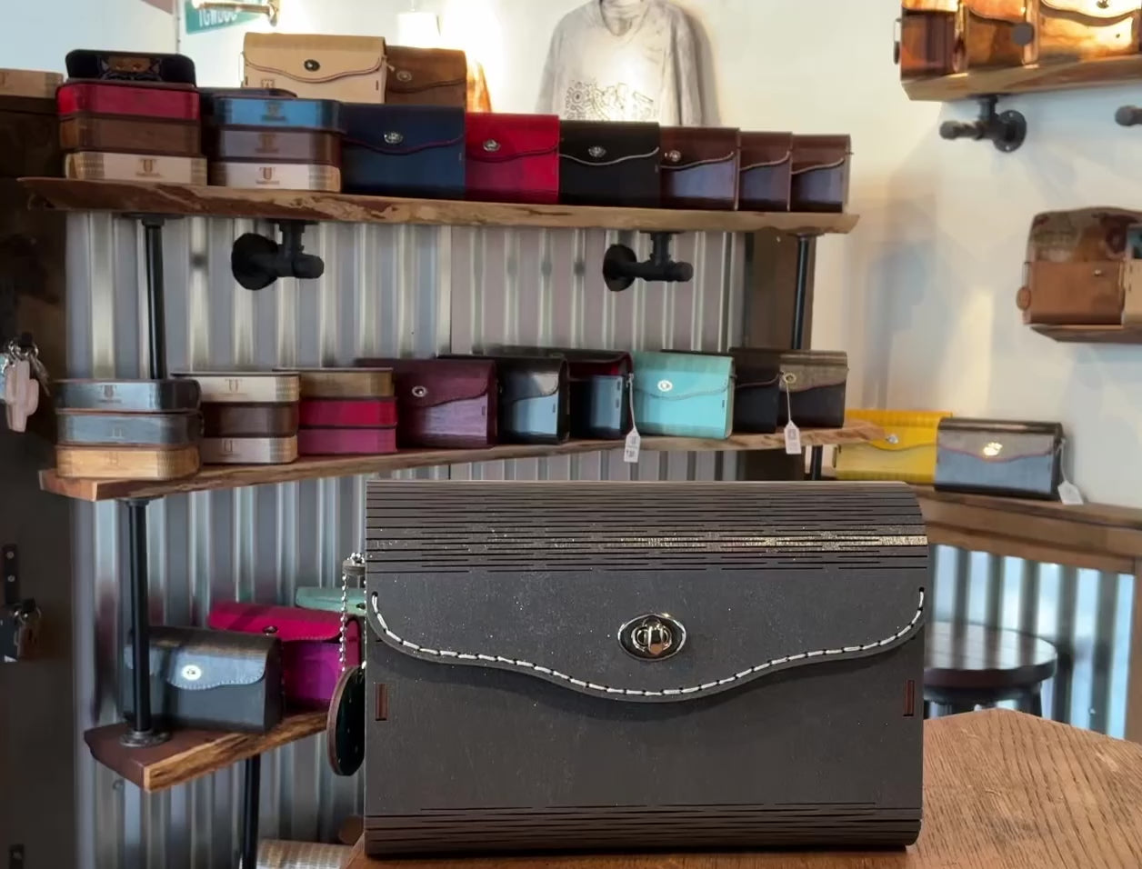 Premium Birch wood exterior, with a grey sparkle stain. 100% Cotton glow in the dark interior which is adhered to the wood before cutting for a cohesive experience inside and out. Complimentary strap is included.