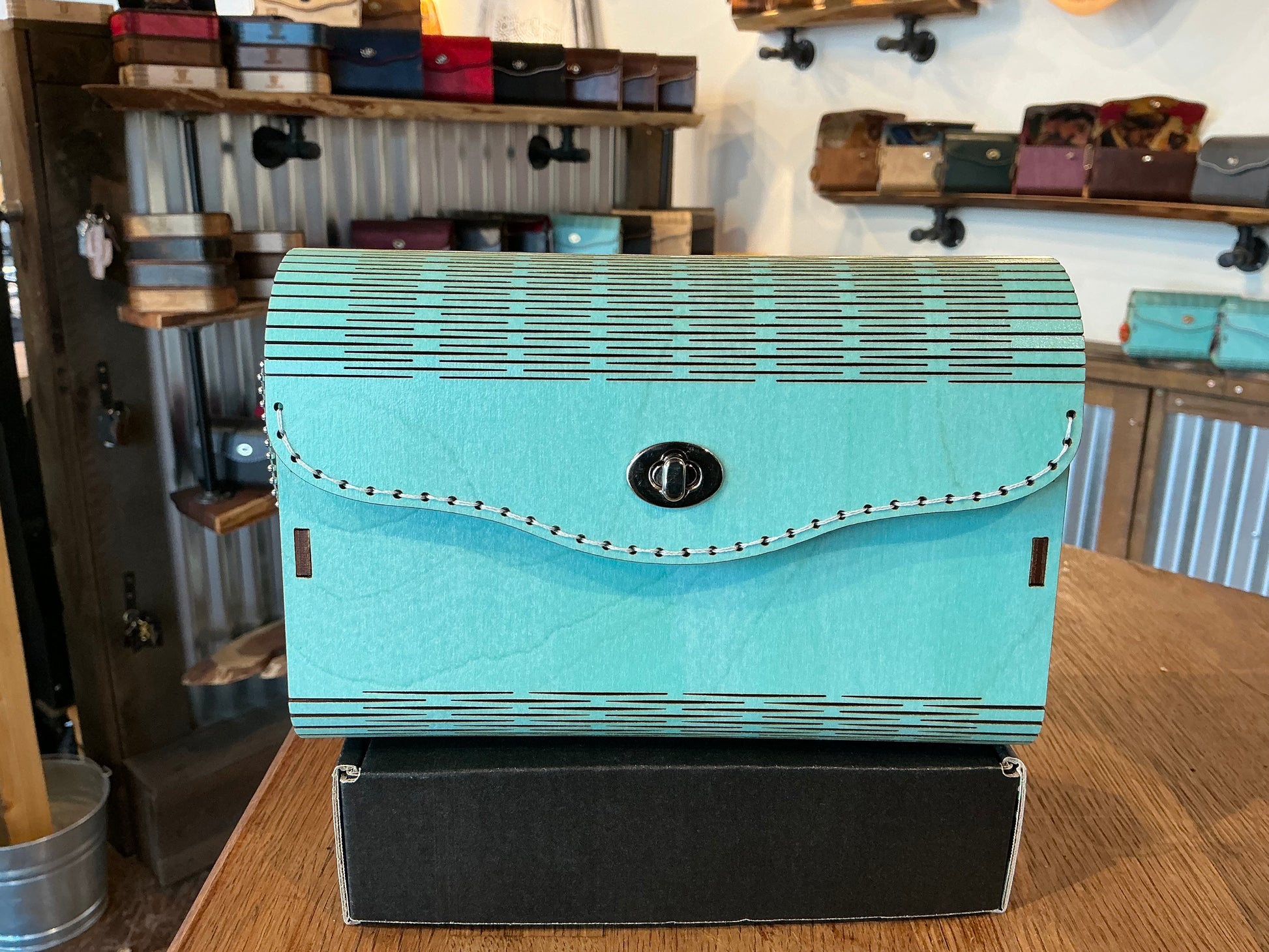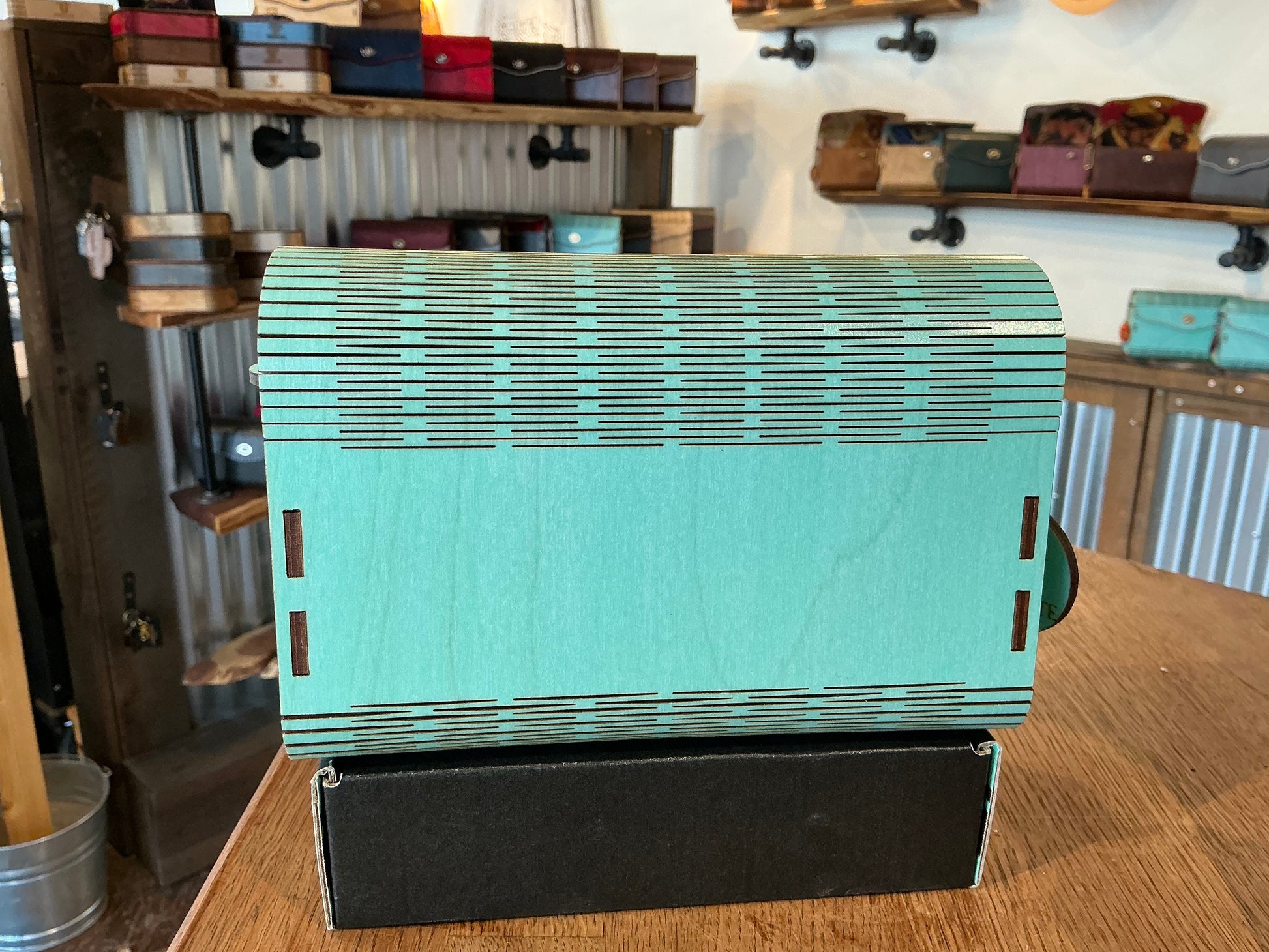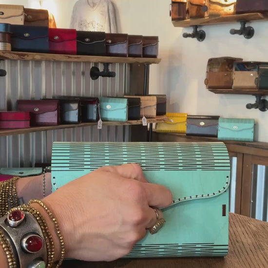 Premium Birch wood exterior, stained and finished in a turquoise stain. 100% Cotton interior which is adhered to the wood before cutting for a cohesive experience inside and out. Completed with silver hardware and a matching strap.