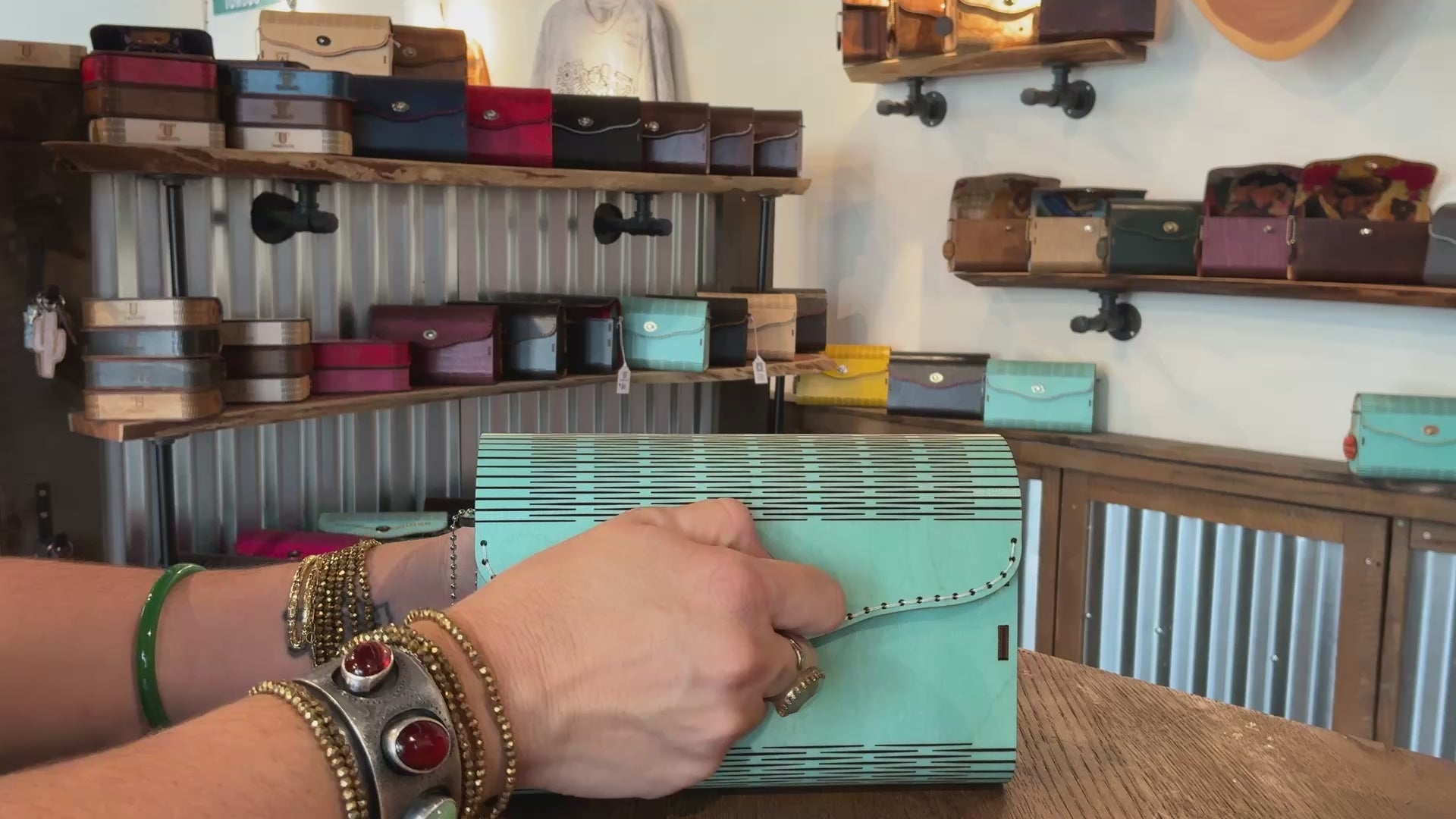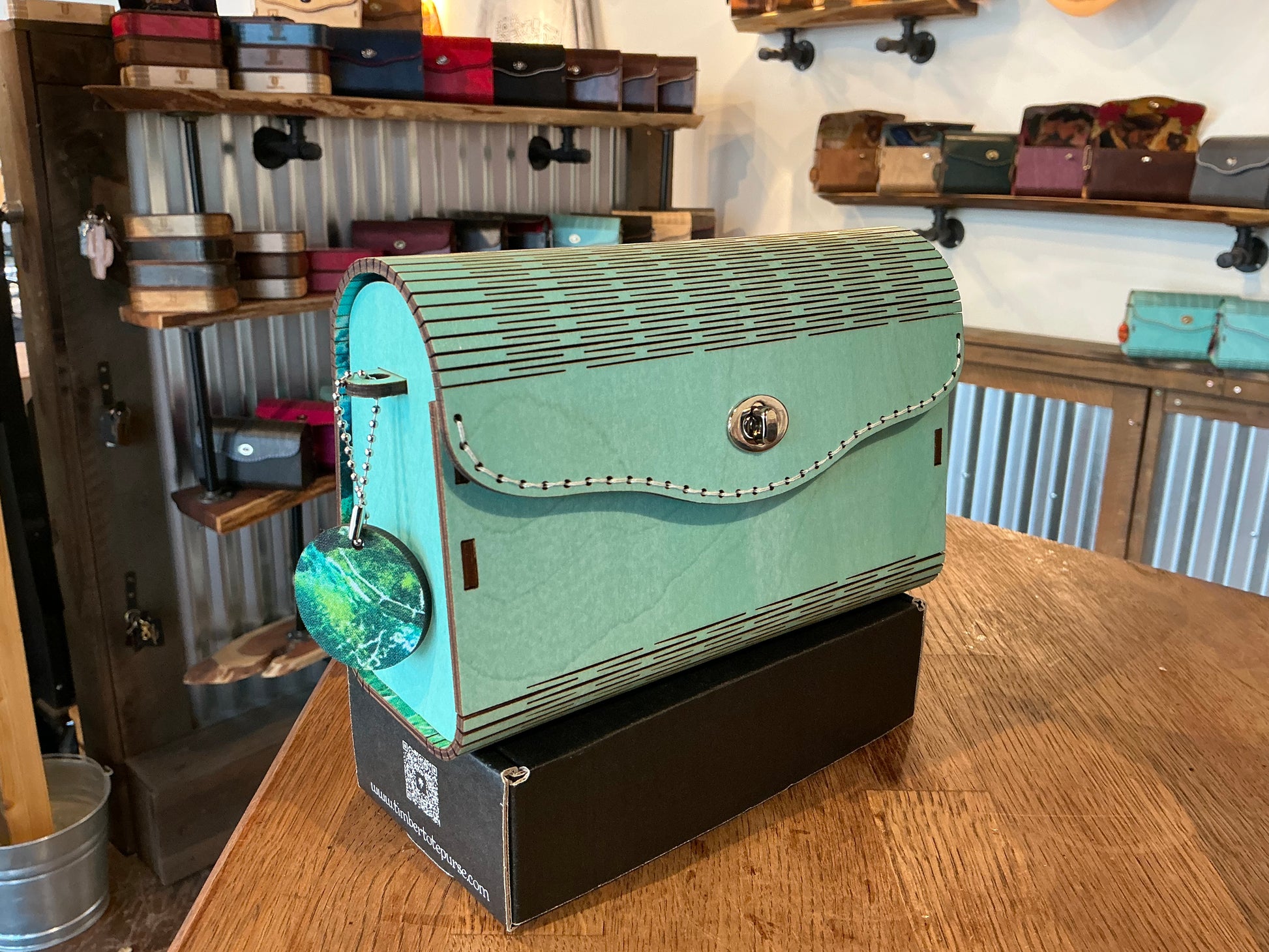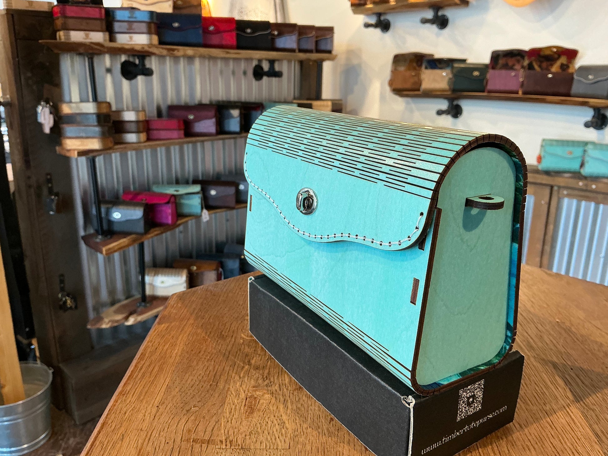 Premium Birch wood exterior, stained and finished in a turquoise stain. 100% Cotton interior which is adhered to the wood before cutting for a cohesive experience inside and out. Completed with silver hardware and a matching strap.