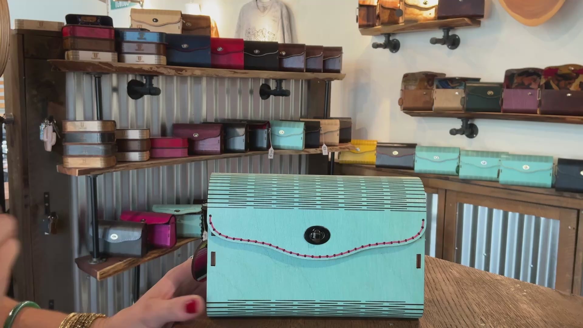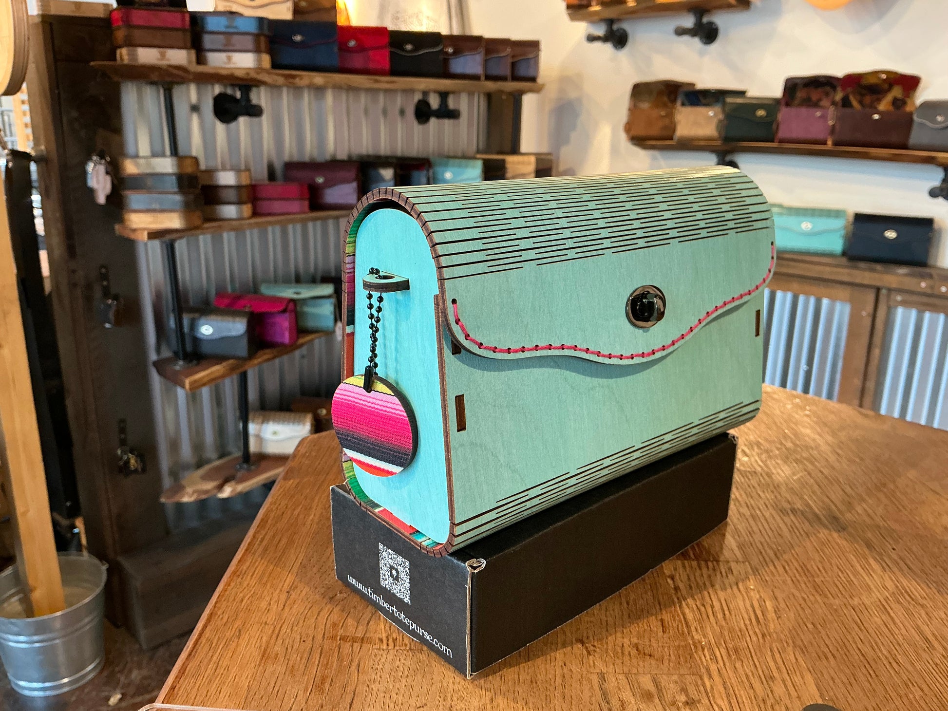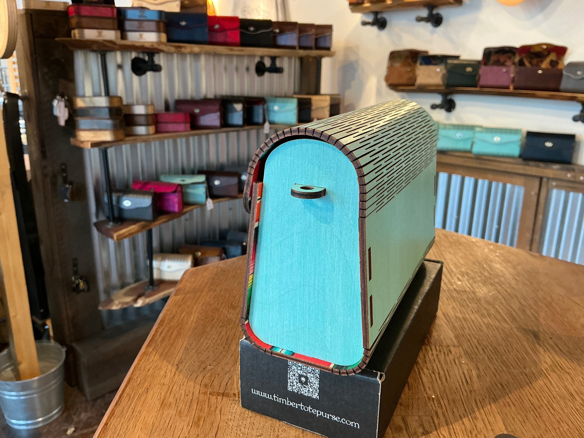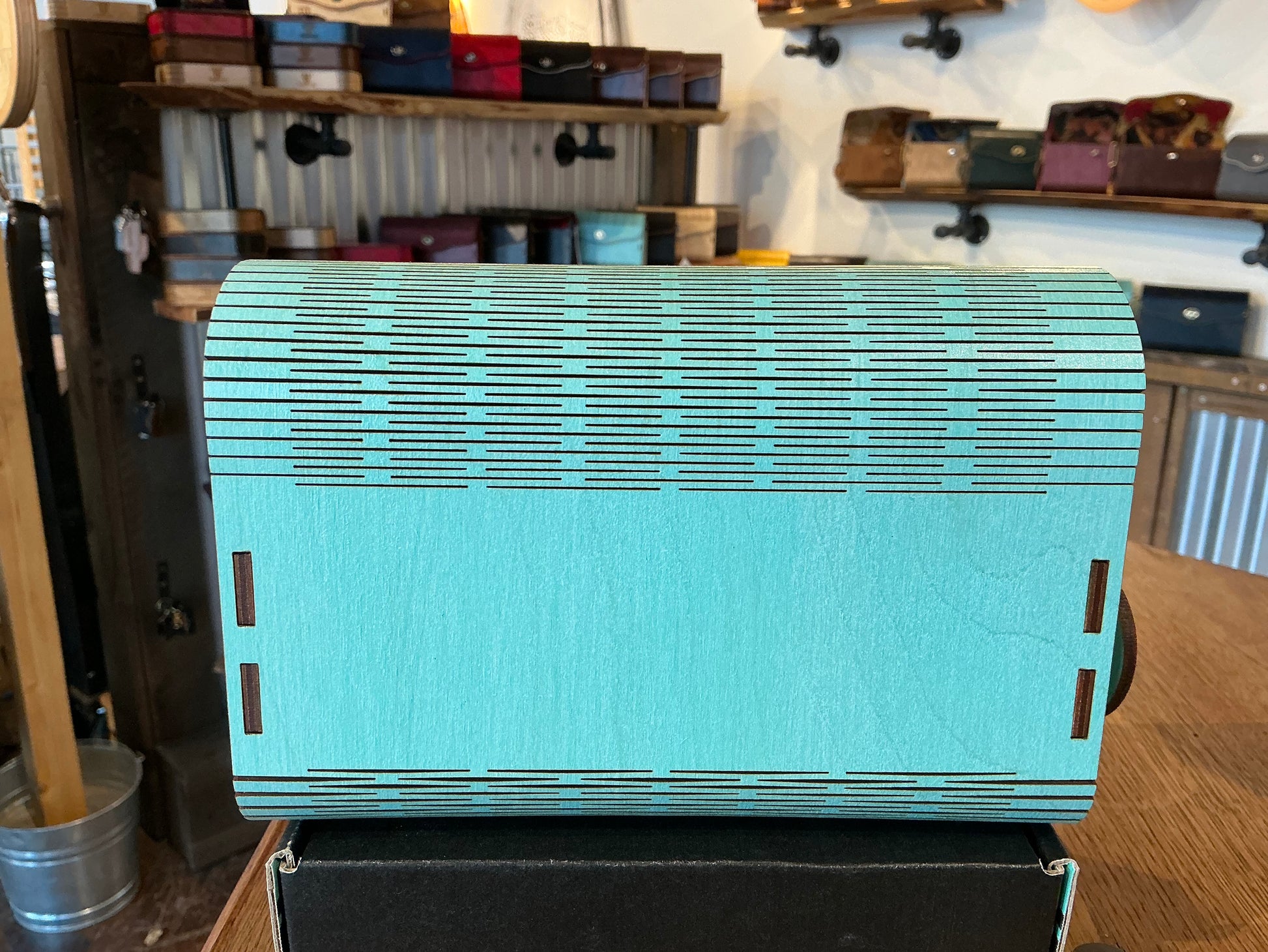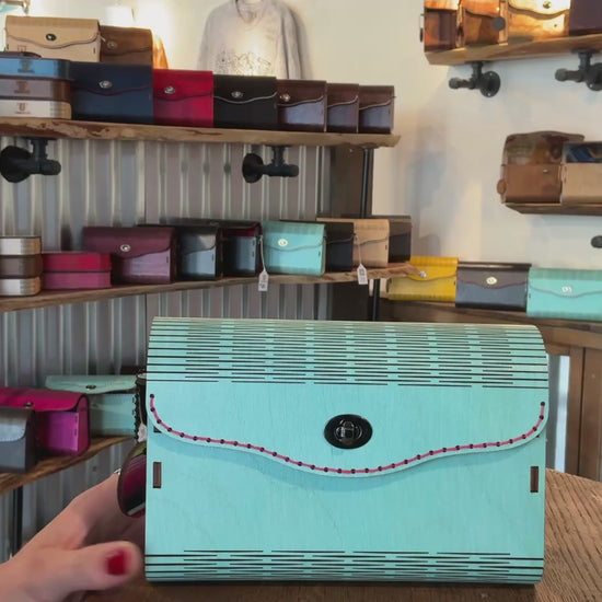 Premium Birch wood exterior, stained and finished in a turquoise stain . 100% Cotton interior which is adhered to the wood before cutting for a cohesive experience inside and out. Completed with black hardware and a matching strap.