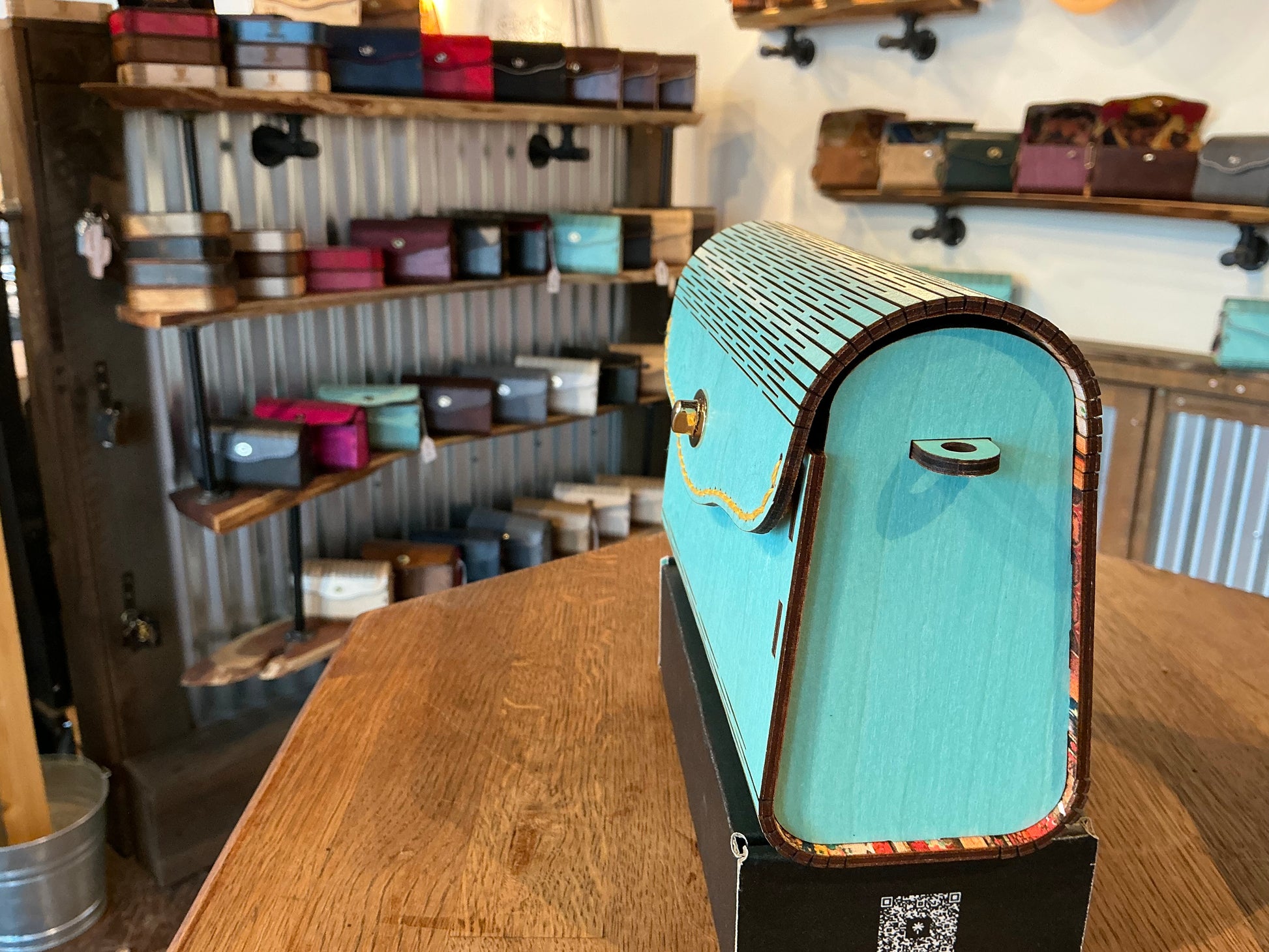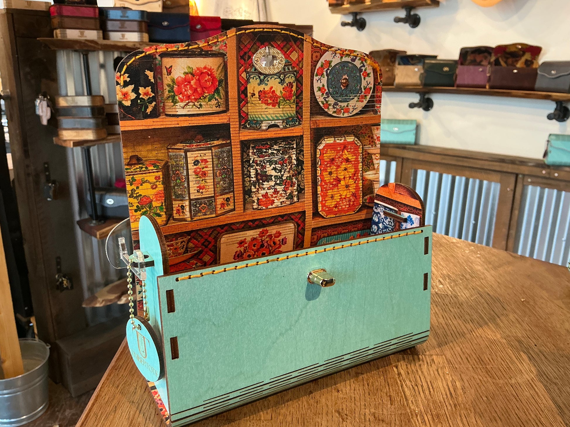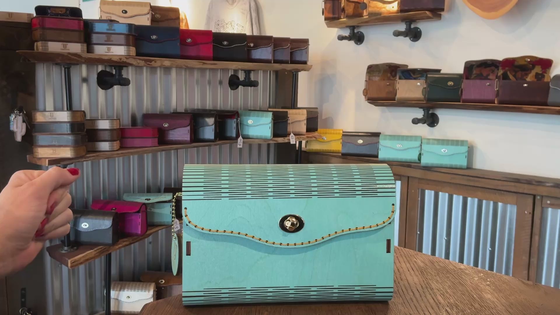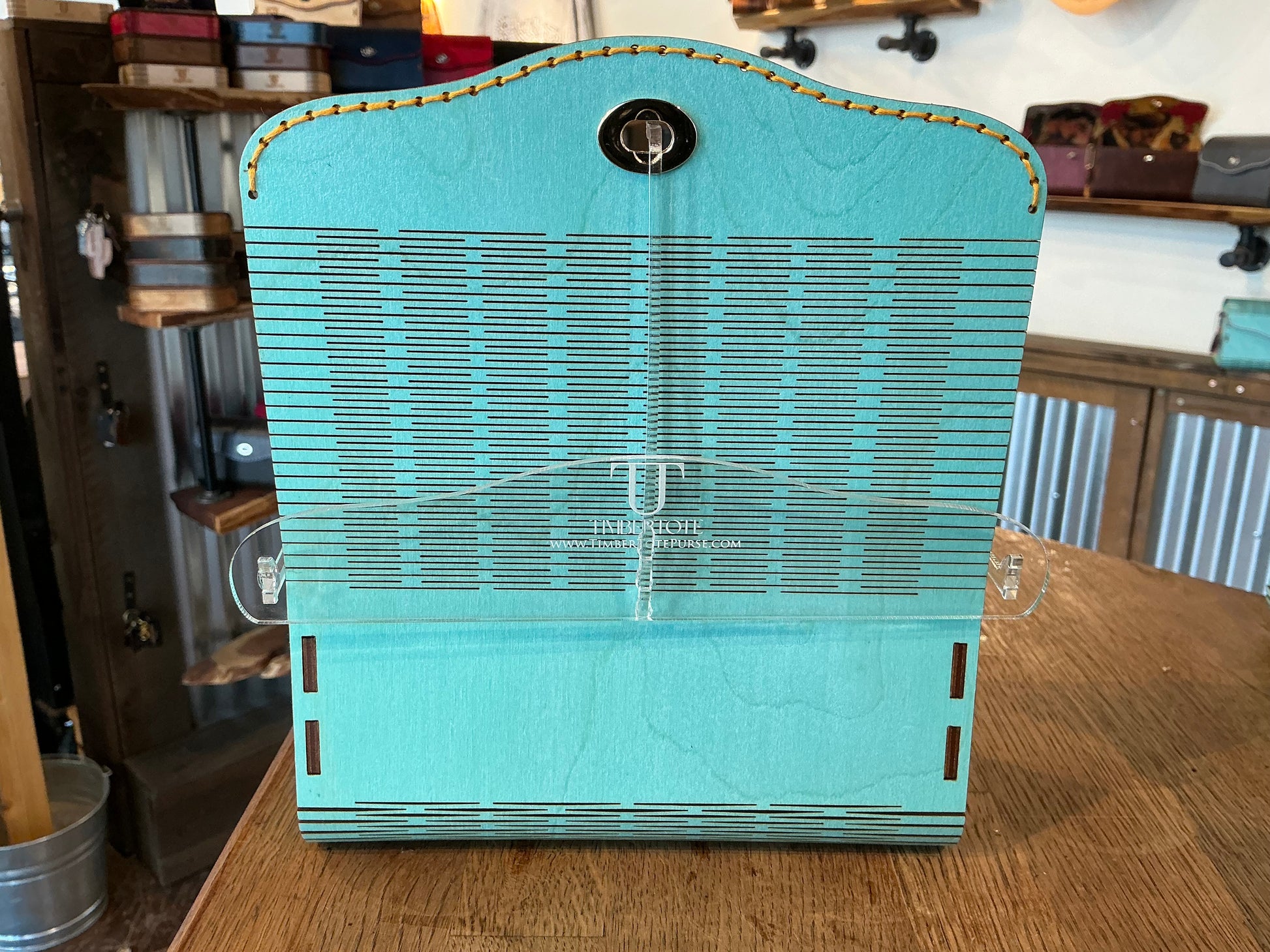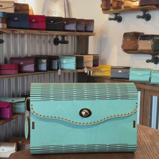 Premium Birch wood exterior, with a turquoise stain. 100% Cotton interior which is adhered to the wood before cutting for a cohesive experience inside and out. Complimentary strap is included.